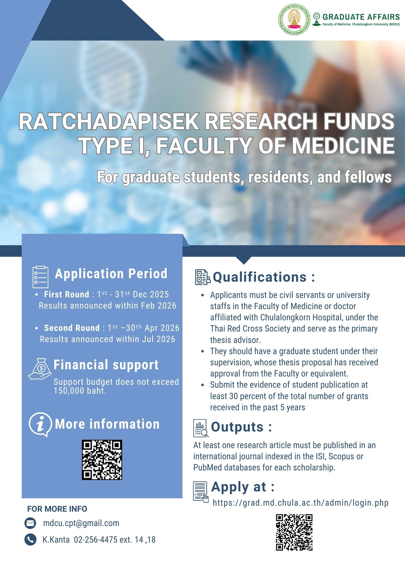 Ratchadapisek Research Funds (TYPE I) (For graduate students, residents, fellows)