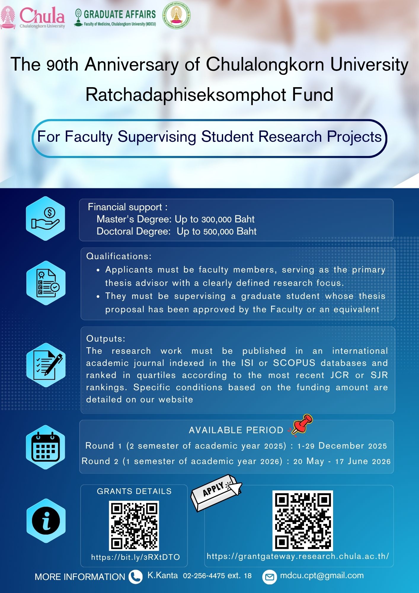 - Applicants must be faculty members within the Faculty of Medicine who serve as the primary thesis advisor and possess a well-defined research focus.